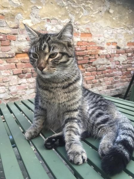 Gråstripet, korthåret, hvit hake, sort haletipp, ingen chip.
