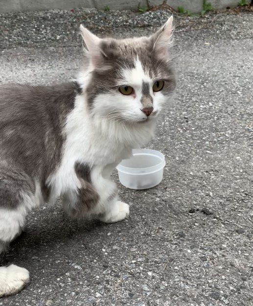 Grå og hvit, klippet på kroppen, men halen er langhåret grå. Velstelt, men lite sår på høyre øre. Kontaktsøkende. Testet med litt hundetørrfor, og den var sulten ja.