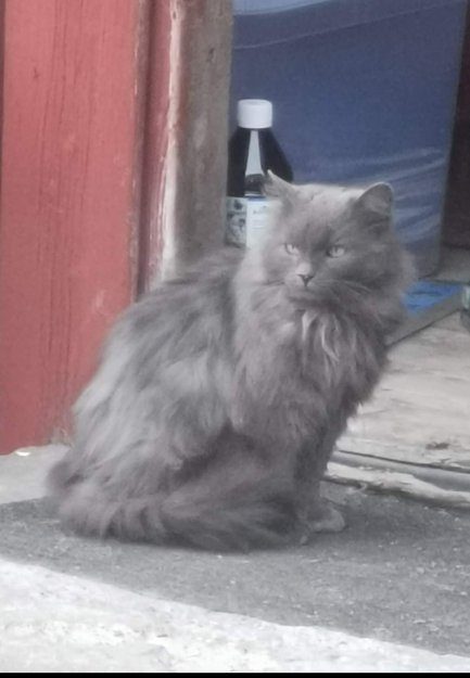 Antatt hankatt, langhåret. Grå/svart. Veldig sky, sulten og stygg i pelsen. Bærer preg av å ha gått ute lenge.
