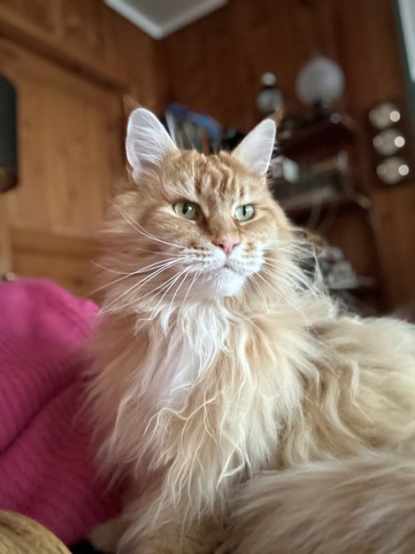 Stor hunkatt, mellom 8-10kg. Rød og langhåret, med litt hvitt i ansiktet.