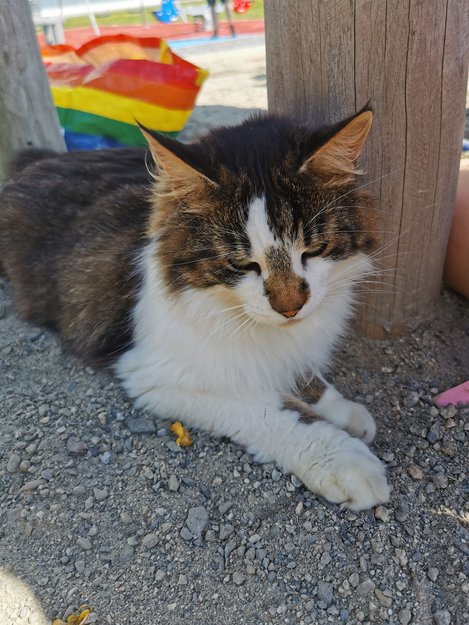 Katt som holder seg rundt blokkene. Ingen kjenner den igjen. Kontaktsøkende og vant med barn og voksne. Har bånd uten info med bjelle på. Mjauer utenfor blokkene om natten og har blitt tynnere de siste ukene. Har masse flott, ellers virker den fin. Vil tro noen savner den!