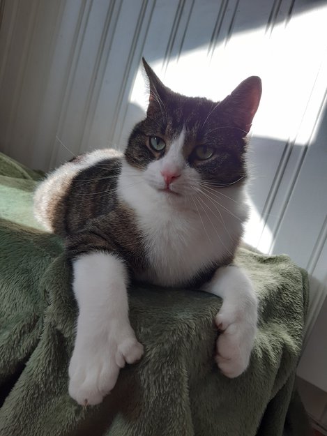Skipskatt - store poter med tommeltotter. Veldig sosial og prater mye. Spesielt glad i barn.