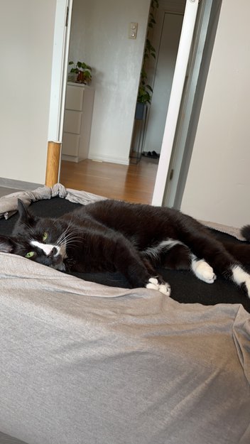 Svart nese, hvite poter, har noen små svarte prikker nede på de hvite potene