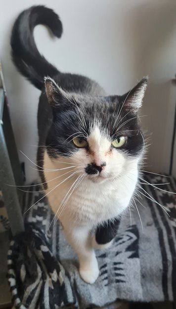 Svart/ hvit, hvitt ansikt med svart bart. Svart på venstre forben, svart hale.