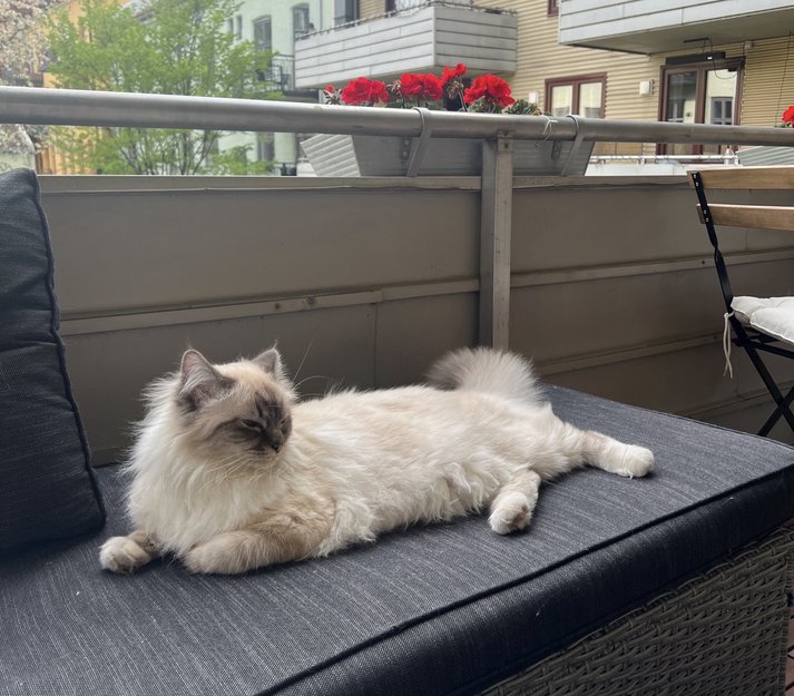 Hvit katt som er grå i fjeset og halen. 1 år. Rød halsbånd med stor hvit gps tracker på som normalt lyser blått (usikker nå pga batteri).