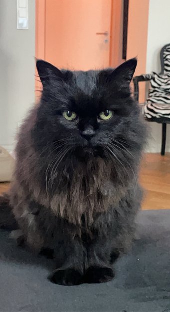 Sort og brun katt med grå hår innimellom. Litt grå stær på venstre øye. Sky og nervøs