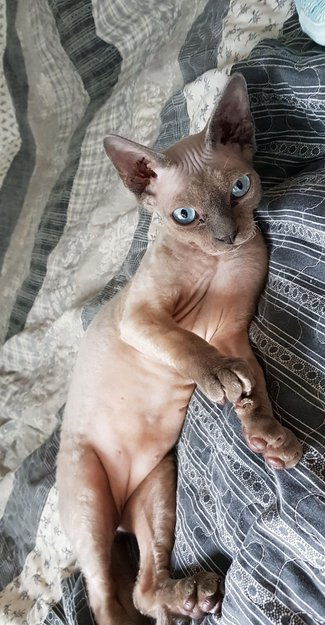 Tynn kropp med lang øyrer. Store øys blå øyene. Lite krøllete pels. Miauer mye og er veldig vennlig. Han liker å kose med alle.