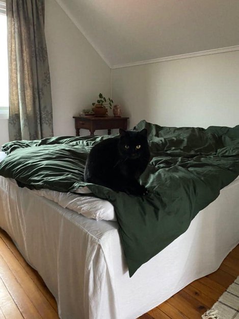 Hun er fire år, har helt sort pels og har barbert den ene bakpoten sin. Veldig myk pels, men litt sjenert og menneskesky.
