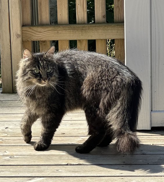 Er veldig sjenert, men kan «snakke» tilbake når jeg prater til den. Ser ut til å være en ganske ung katt og meget pen. Har flere bilder om ønskelig.