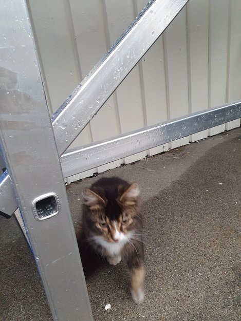 Tror d er en ung katt. Hvit på deler av snute og hvit strek opp mot pannen.