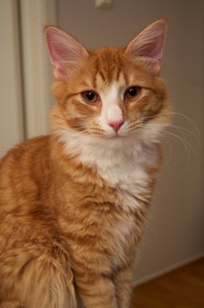 Hovedsaklig oransje med hvite poter, hvit hals og hvitt munnparti/nese. Er merket med en grønn "M" i venstre øre.