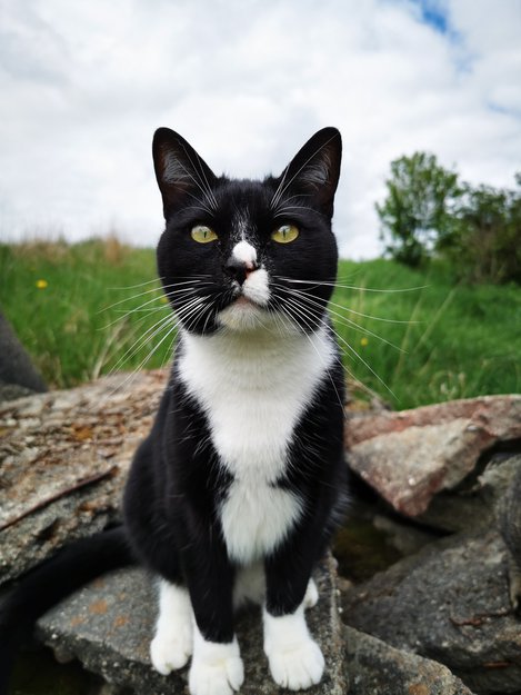 Hunkatt på 3 år, svart med hvite labber, bryst og mage.