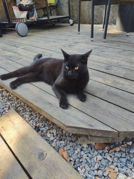 Er ikke idmerket. Ser gyllen brun ut i godt lys. Pratsom liten kar 4,4 kg, ca. 1år gammel og matglade. Kosete, tillitsfull, men litt skvetten. Nå kastrert, fått orm og flott kur.