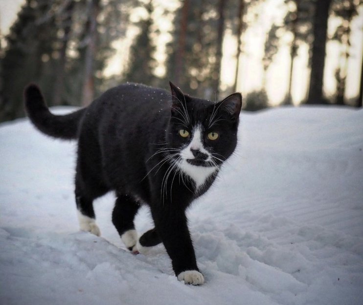 Svart og hvit katt med svart bart på venstre side! Hvite labber. ID tatto i øret og chip! Chippen står på David Berg. Lange hvite værhår og øyenbryn.