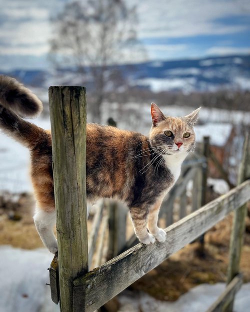 Skilpaddefarget . Litt sky,men veldig sosial. Hvit ved snute og på bryst.