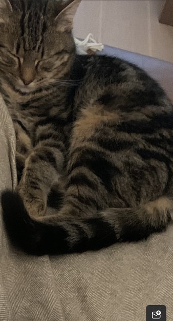 Spraglete/tigerstripet hannkatt. Snill og forsiktig.