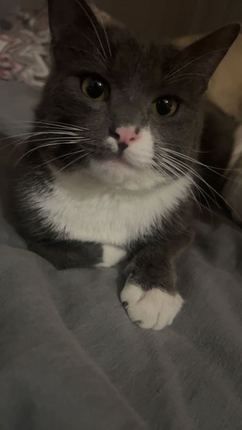 Rosa nese, lang og tynn, grå og hvit, Hvite poter. Hvit på den ene siden av nesen, med en liten hvit flekk på den andre siden.