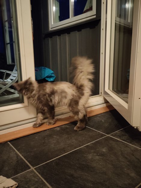 Oppholder seg i hytteområde ved Rakkestadstranda i Bamble. Kom til oss i går kveld. Fått mat, og henger fortsatt rundt her.