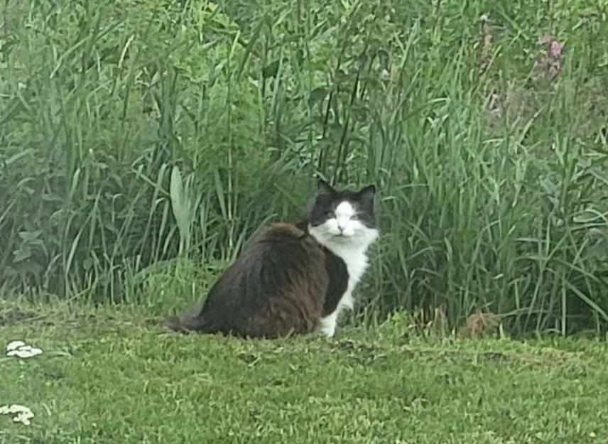 Sky, men vil inn. Løper unna når man kommer. Skillet mellom sort og hvitt går over øynene. Tykk hale, men uvisst om det skyldes oss, katten vår, eller andre katter som den har slåss med på feltet. Holder seg i området. Ny for oss.