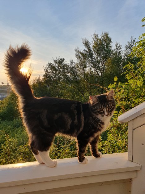 Veldig sosial og tillitsfull. Mjauer mye. Kosete. 1 år. Svært fluffy pels. Mangler pels på en liten flekk på øret.