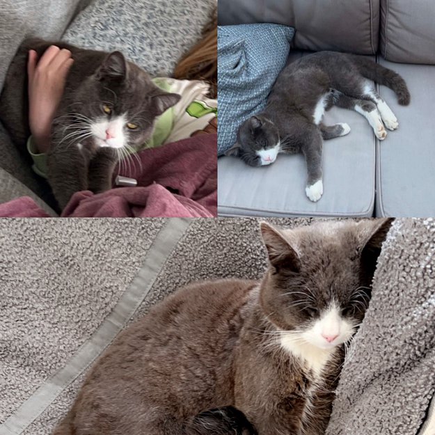 Han er grå og hvit, hvite poter foran og hvite sokker bak med litt grått