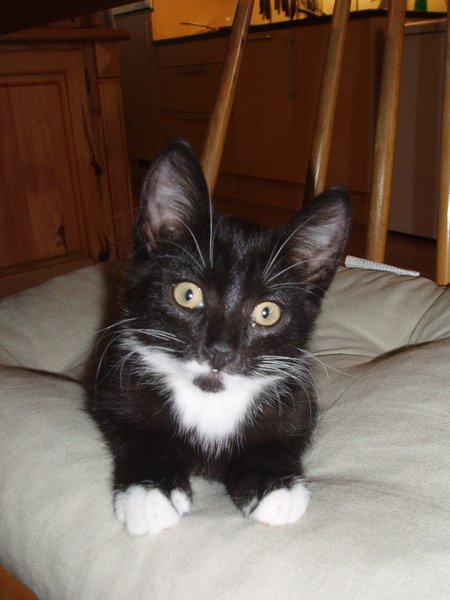 Svart liten katt med kvitt på poter og under haka