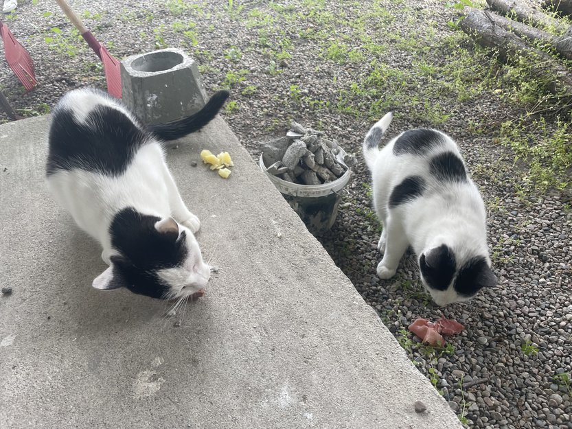 Hei, jeg har funnet to katter, som er tynne og leiter hardt etter og finne mat. De kommer opp på verandaen til mange folk her i nabolaget. To katter som er hvit og svart:)