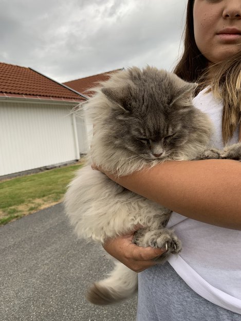 Nydelig langhåret katt. Fargen er nyanser av grått, fra ganske mørk til helt lys. Veldig myk pels, rasekatt? Stor buskete hale. Mye floker.