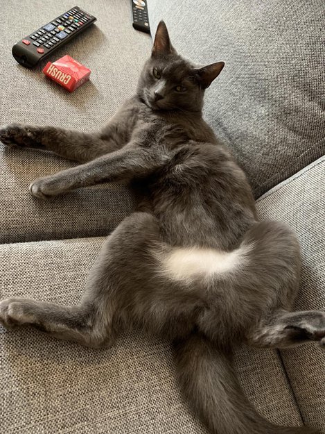 Mørkegrå pels med en hvit pelsflekk på mageområdet.