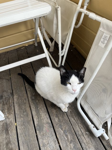 Hvit katt med svarte ører, hale og to svarte flekker på ryggen har kommet til oss de siste dagene. Den vil gjerne inn, er veldig kontaktsøkende, prater mye og er veldig tynn. Er det noen som savner/kjenner til denne?