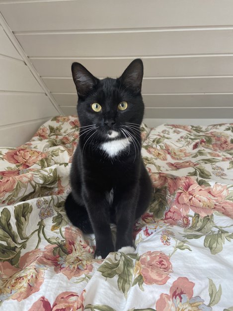 Svart katt med hvit hake med en svart flekk på. Hvite poter. Grønngule øyne. Lucy er en katt som elsker kos.