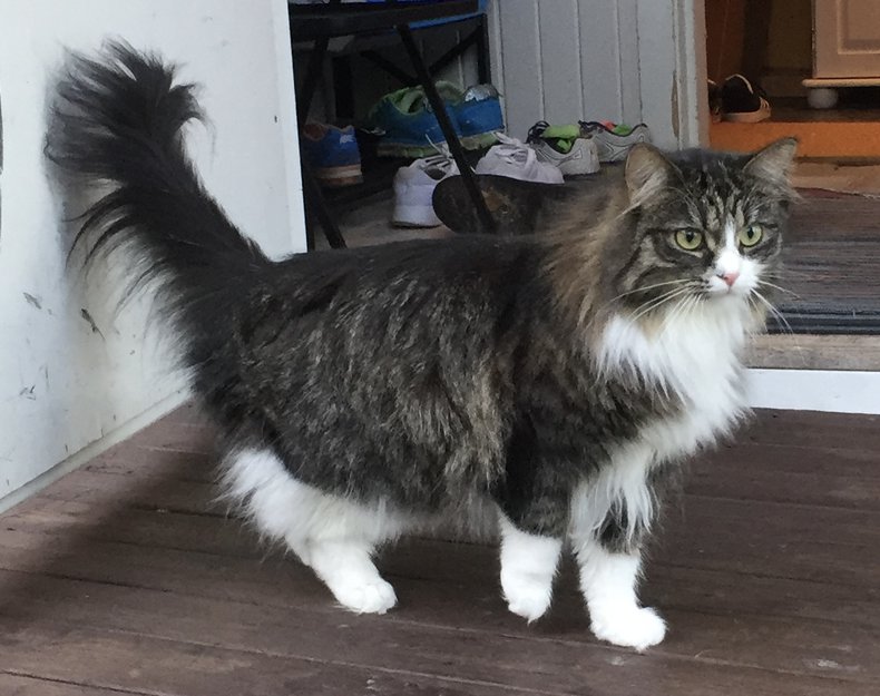 Hun er chippet og heter Selma. Halvt norsk skogskatt. Lang og myk pels. Stor hale. Store grønne øyne og asymmetrisk mønster i ansiktet. Hun har en svart flekk på det ene bakbeinet. Hun er slank, veier 3 kg.