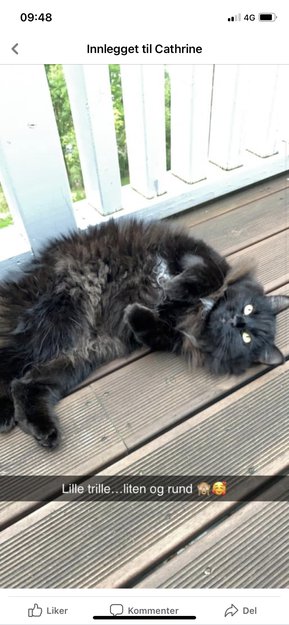 Kom hjem etter over 4uker på rømmen. Tror hun har vert innelåst en plass. Kjempe tynn. Men fin i pelsen. Ingen floker. Fin form