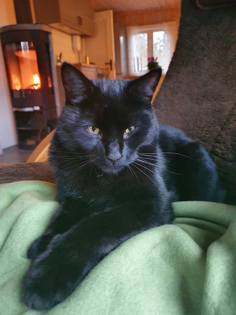 Helt sort, sky og forsiktig, liker seg i trær og klatrer veldig bra. Han er 5 år gammel. Vi savner ham veldig.