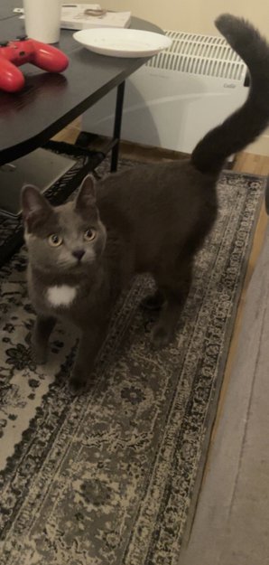 Katten har grå kort pels og en hvis flekk under halsen som ligner litt på hjerteform