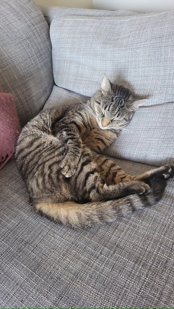Hun er litt sky, ikke veldig kosete, men veldig selskapssyk. Liker å ligge ved siden av oss, kommer og hilser, men går fort igjen! Veldig fascinert av rennende vann.