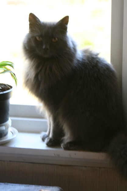 Katten er slank men har mye glatt grå pels.
