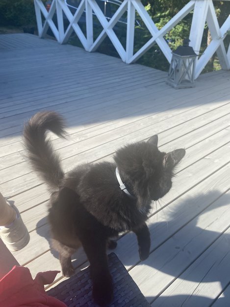 Tynn sulten, katt veldig kjælen med grått halsbånd uten info.