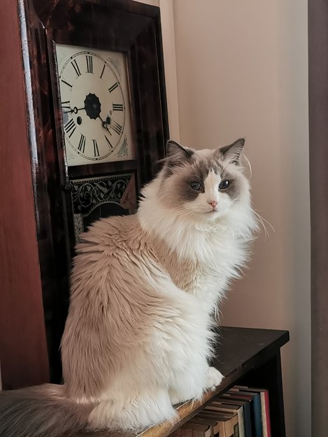 Hvit snute og panne, mørke kinn, hvit krage rundt hals, hvitt bryst og mage, lys brun mot litt grålig rygg, liten hvit stripe før mørk grå/brun hale med svært lange hår. Hvite ben og poter.