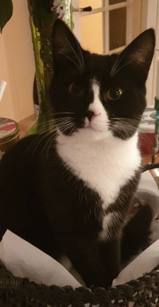 Sort hunnkatt med hvite tegninger i ansiktet, hvite sokker med en sort prikk på venstre bakbein. Kan være sky mot ukjente, men veldig snill og vennlig.