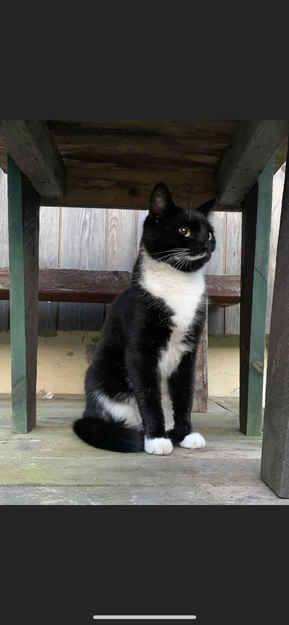 Sort og hvit katt som rusler rundt huset vårt. Veldig kontaktsøkende og kosete. Den står utenfor døren vår og mjauer når vi er inne, og henger rundt oss når vi er ute.