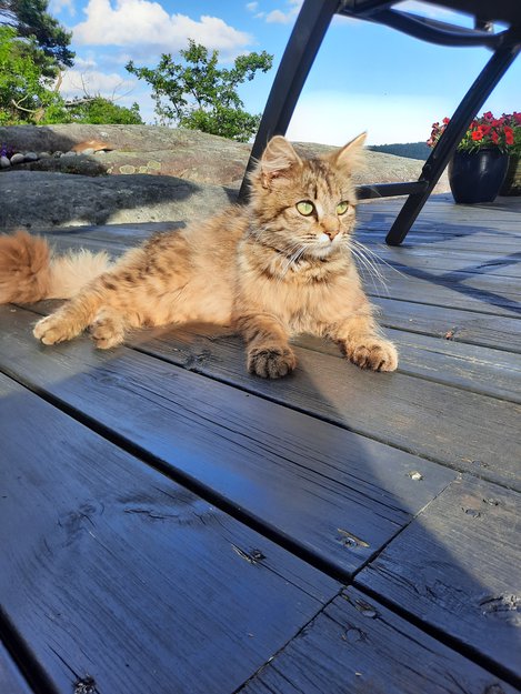 Hun har holdt til her på Eikeland i snart en uke da jeg har matet henne. Ser ut som en hunkatt på knappe 7 måneder. Hun er tam og har en veldig stor appetitt. Hun sluker alt hun får. Virker veldig snill og god.