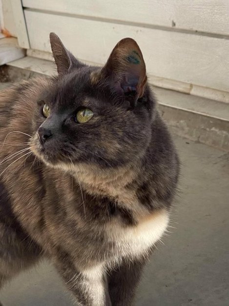 Hun er liten og veier nesten ingen ting. Har litt ekstra store ører, grå nese, gule øyne. To av potene er hvite og ytterst på halen er hvit også.