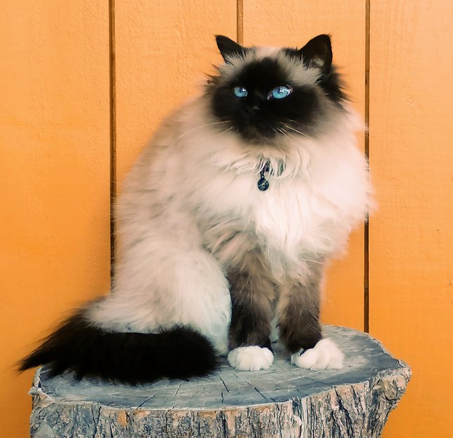 Brunmasket hellig birma, med mørkt fjes og hale, og mørke ben men hvite poter. Halsbånd med bjelle og en tracker som er tom for batteri.