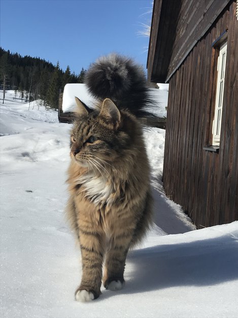 Hun har hvite poter og er litt hvit på brystet. Glad i mat og mennesker.