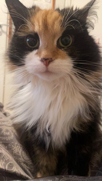 Zappa forsvant i går og bruker vanligvis ikke å være borte lengre enn en time. Hun har nettopp fått en ormekur, da hun har slitt med matlyst og oppkast i et par dager. Dermed ser hun kanskje litt pjusk ut, og håret på bakhodet/nakken er klipt kort for å komme til med kuren. Hun har svarte fregner på snuten, så snuten minner om et hjerte. Potene og magen hennes er hvit, den høyre framfoten har et mer spranglende mønster. Ryggen hennes er svart, men du ser hint av det oransje. Kan være sjenert mot fremmede.