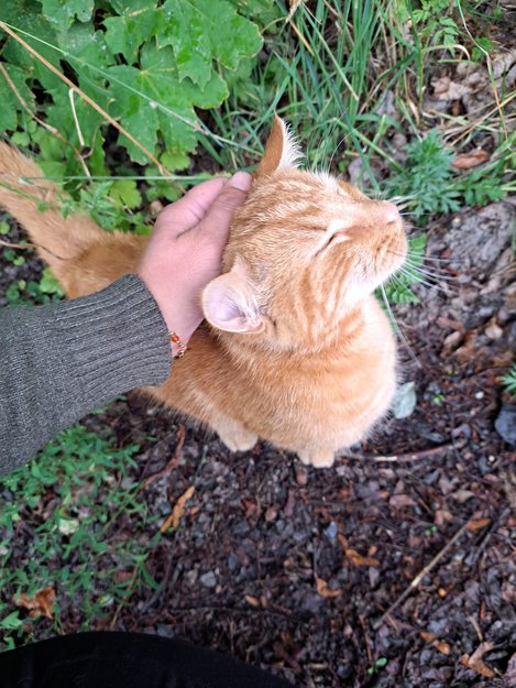 Superkosete katt koset med rett ved hovedinngangen til Sofjellshøgda helsehus. Hørte den mjaue på vei inn dit og måtte undersøke hvorfor. Den maler og mjauer hele tiden. Veldig tillitsfull og hoppet oppå fanget og skulderen min når jeg satt med ned. Ganske sikker på at det er en kastrert ung guttekatt. Helt nydelig!