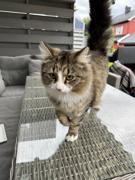 Katten har vært utenfor flere ganger tidligere i sommer, i dag har den holdt til utenfor på veranda hele dagen.
