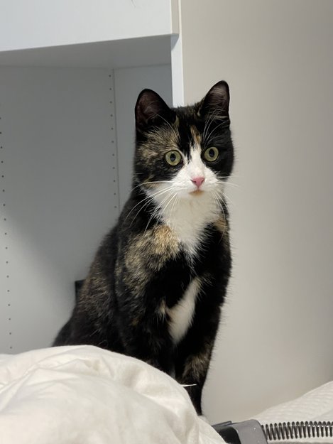 Hvitt bless. Tricolor Katten er tatt inn av Dyrenes Hus. Ta kontakt om du er eier av katten.