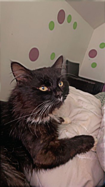 Mavros er en langhåret svart Teffany katt, han er litt sjenert for folk, han har ikke brikke eller halsbånd.